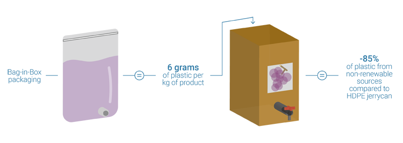 It is possible to calculate the quantity of plastic (obtained from non-renewable oil-based materials) used per kg of extract packed in bag-in-boxes or in conventional jerrycans: